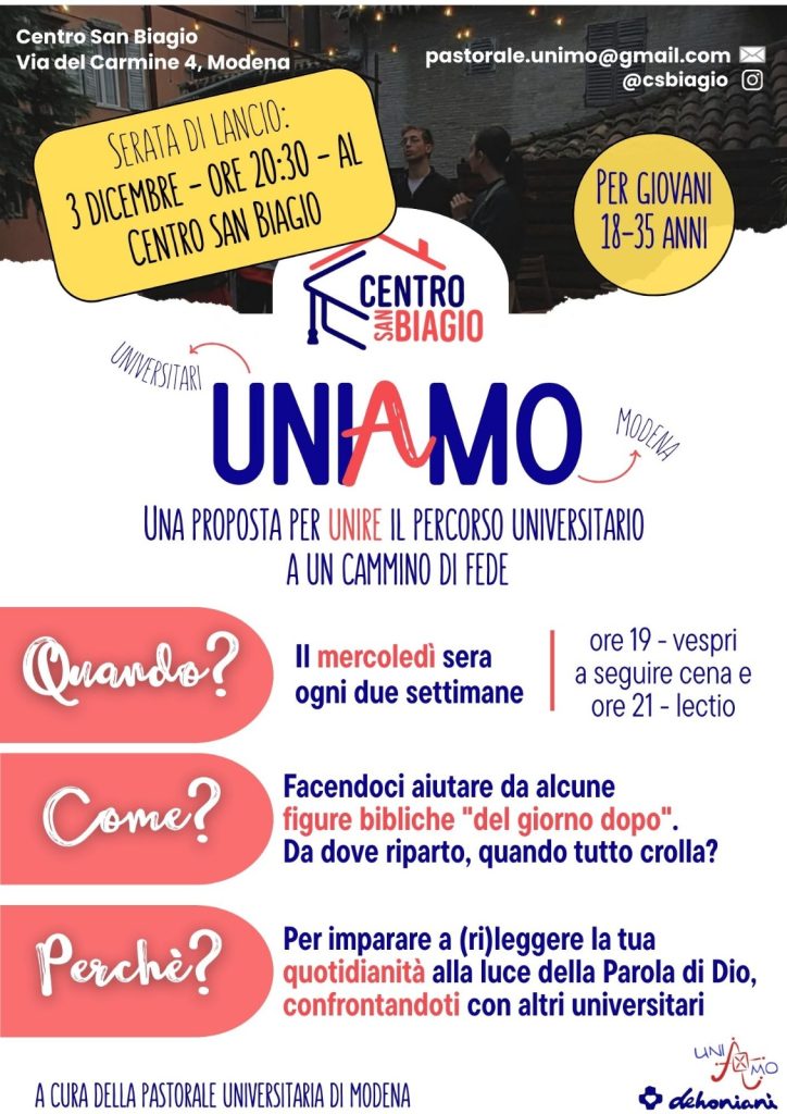 Dopo un po’ di tempo che non ci sentiamo, ecco che riparte il percorso per giovani studenti universitari. Si chiama UniAMo – Universitari a Modena. Ci vediamo il mercoledì, uno ogni due (per il calendario controllate l’IG @csbiagio), dalle 19 alle 22. Si prega insieme, si mangia insieme in allegria e poi ci si confronta con la Parola di Dio in una breve lectio divina.